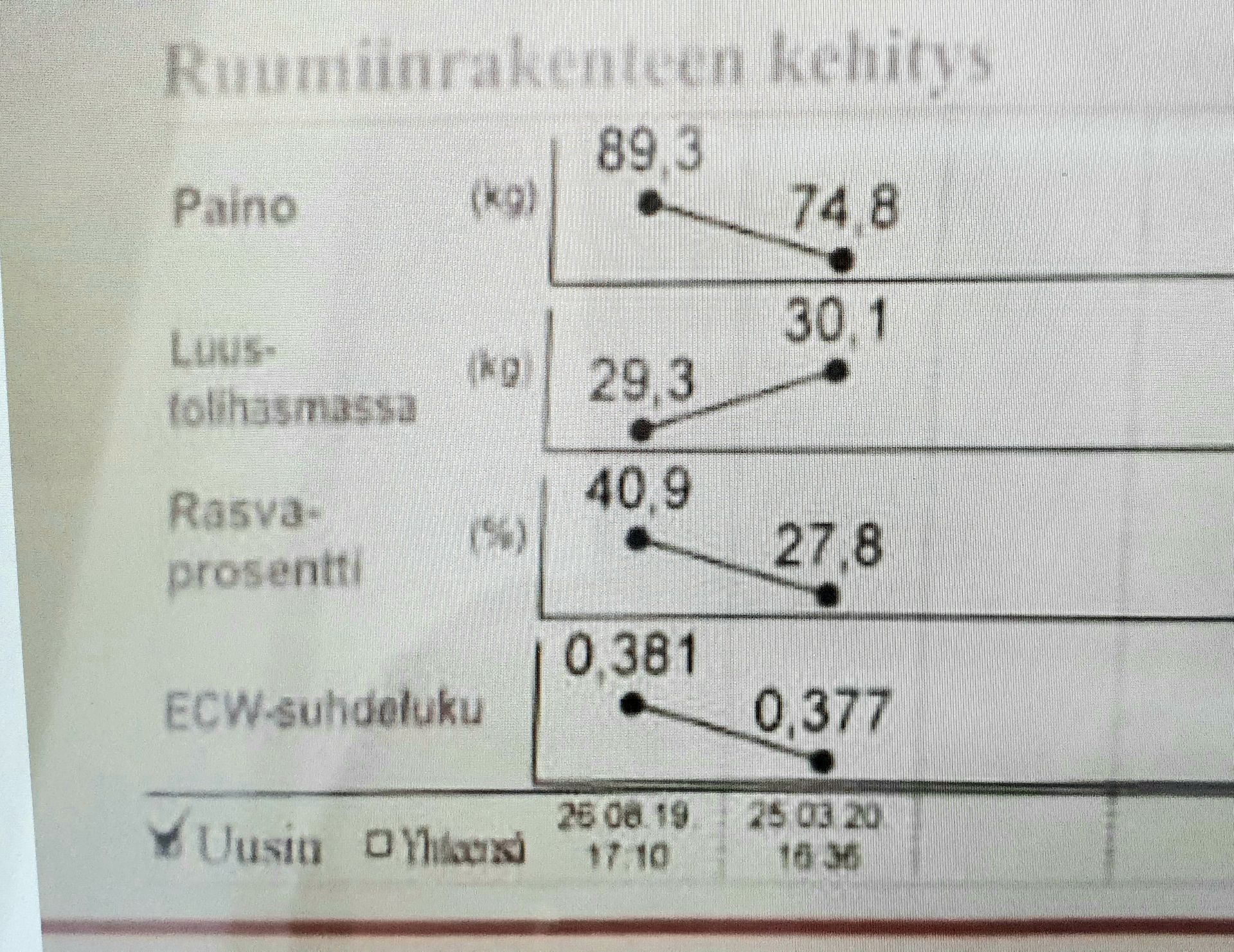 Puolessa vuodessa painoa on tippunut 14,5kg josta kaikki on pelkkää rasvaa (29voipakettia). Lihasmassa kasvoi 800g ja rasvaprosentti tippui 13,1%.