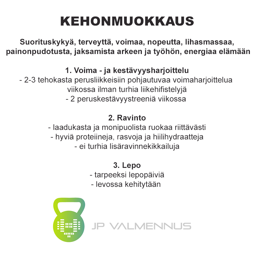 Kehonmuokkauksessa riittää kaksi-kolme voimaharjoittelua ja kaksi kestävyysharjoittelua viikossa. Tällä treenimäärällä viikkoon tulee tarpeeksi lepopäiviä jotta keho vahvistuu. Eli kroppaa ei minun valmennuksessa rääkätä ylenpalttisella ja ylikovalla treenillä joka ajaa kropan ainoastaan ylirasitustilaan ja kehonmuokkauksen tulokset jäävät todella laihoiksi. Lisäksi syödään laadukkaasti, monipuolisesti ja RIITTÄVÄSTI.