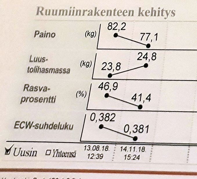 Ja mikä on tärkeintä, terveysriskit ovat pienentyneet. Esim. viskeraalirasva eli sisäelinten ympärillä oleva vaarallinen rasva on tippunut huonolta alueelta jo tässä vaiheessa ok alueelle.