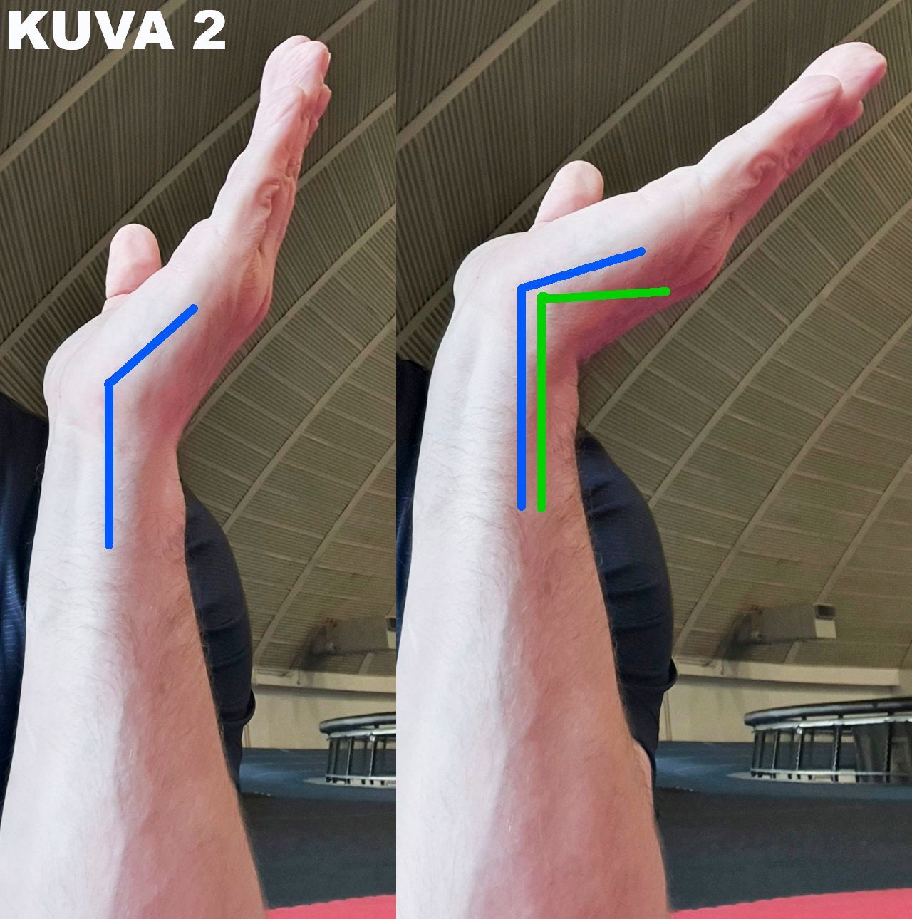 Kuvassa kaksi on ensimmäisenä heikko rannenivelen liikkuvuus. Toisena on parempi joka ei aiheuta ongelmia, mutta liikkuvuus olisi hyvä olla vihreän viivan mukainen.