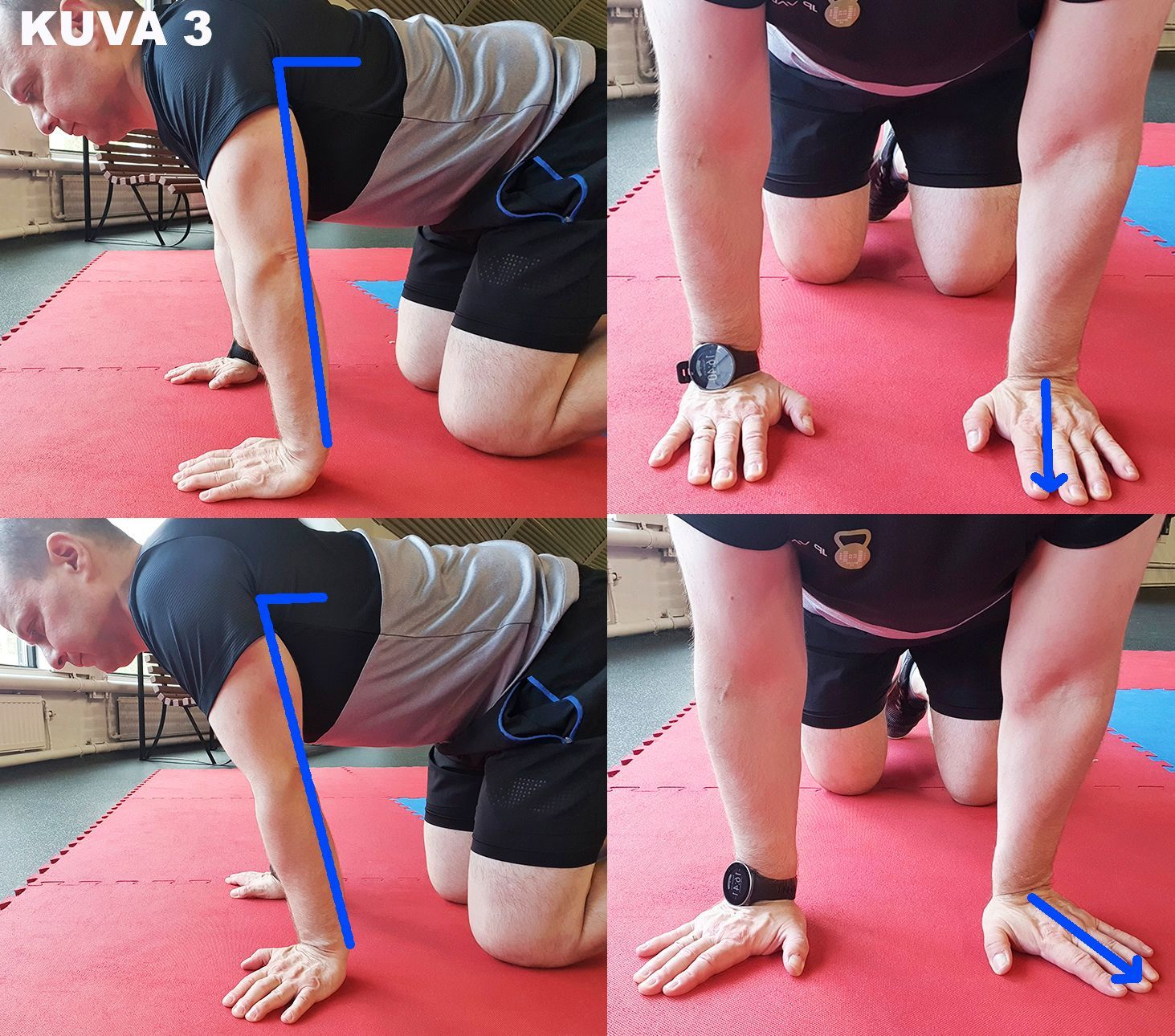 Kolmannessa kuvassa nähdään miten ranteen asento vaikuttaa rannenivelen liikkuvuuteen. Etunojapunnerrukset kannattaa tehdä kuvan mukaisesti niin, että sormet ovat ulospäin, silloin rannenivel liikkuu enemmän kuin, että sormet ovat suoraan eteenpäin.